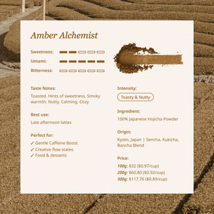 Did you know in Japan, hojicha is fed to babies? Enjoyed by elderly, the Alchemist is safe for all ages — more than suitable for caffeine sensitive individuals, he is almost a decaffeinated matcha if it wasn't for the amber hue.