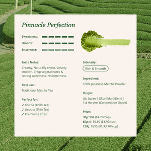 Once you taste Pinnacle. You can't go back. She is exceptionally rich and smooth, with hints of mouth-puckering dryness that's very pleasant. No bitterness. Pinnacle packs strong, fresh Japanese green tea flavours throughout, leaving a clean and sweet aftertaste to be savoured.
