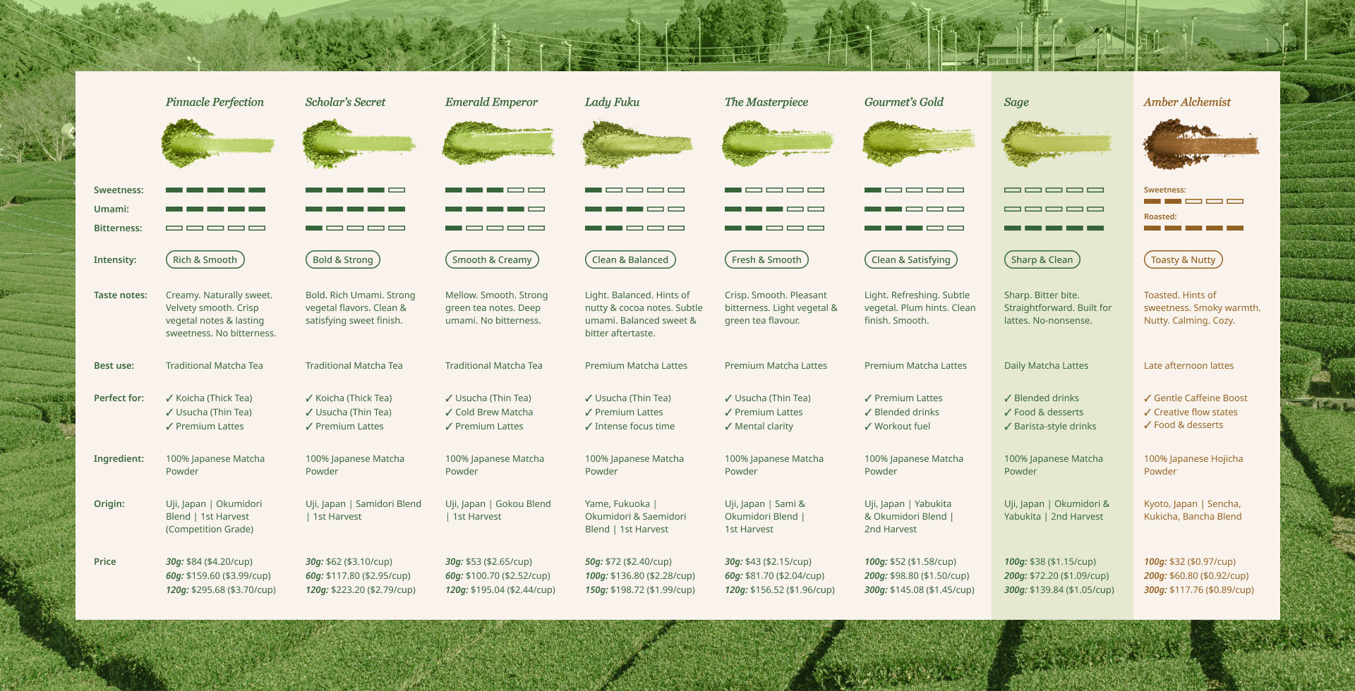 He is a matcha of sharp qualities. The underdog is obsessed with impressing you with simple and easy flavours to appreciate — light, sharp, clean bitter astringent aftertastes. No grassy or fishiness when made in iced lattes. Like the rest of his family, Sage is smooth and blends well with most milks without a doubt.