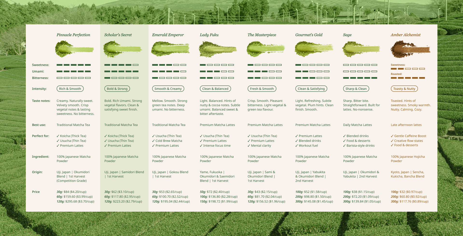 Perfect for: | ✓ Koicha (Thick Tea)✓ Usucha (Thin Tea)✓ Premium Lattes | ✓ Usucha (Thin Tea)✓ Cold Brew Matcha✓ Premium Lattes | ✓ Usucha (Thin Tea)✓ Premium Lattes✓ Intense focus time | ✓ Usucha (Thin Tea)✓ Premium Lattes✓ Mental clarity | |